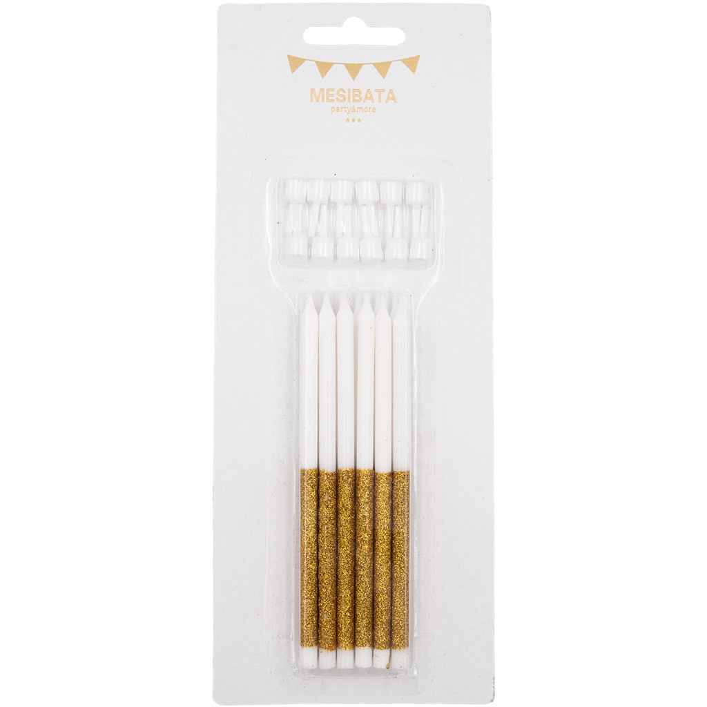 סט המכיל 12 נרות לבנים, שחלקם התחתון טבול בגליטר זהב מנצנץ וחלומי + 12 מעמדי נר מפלסטיק לבן.