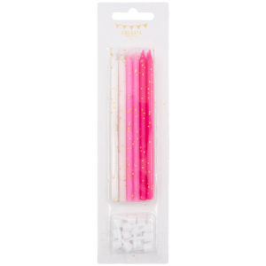 סט המכיל 12 נרות, מעוטרים בנצנצים בצבע כסף ו- 12 מחזיקי נר.