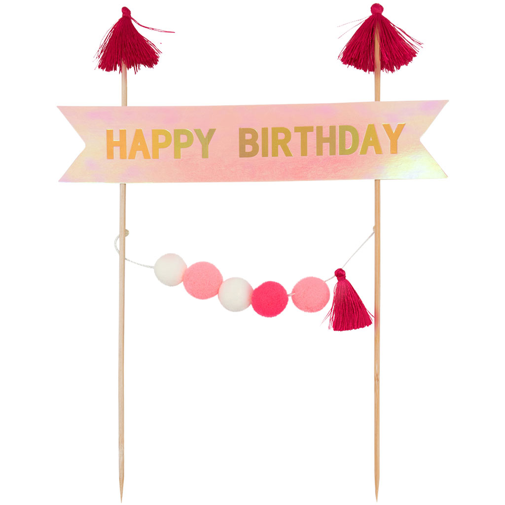 טופר קישוט מרהיב לעוגה, המורכב משני קיסמים ארוכים שביניהם שרשרת פונפונים בגווני ורוד ולבן. בחזית כרזת HAPPY BIRTHDAY בפוייל זהב על רקע אירידיסנט.