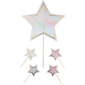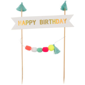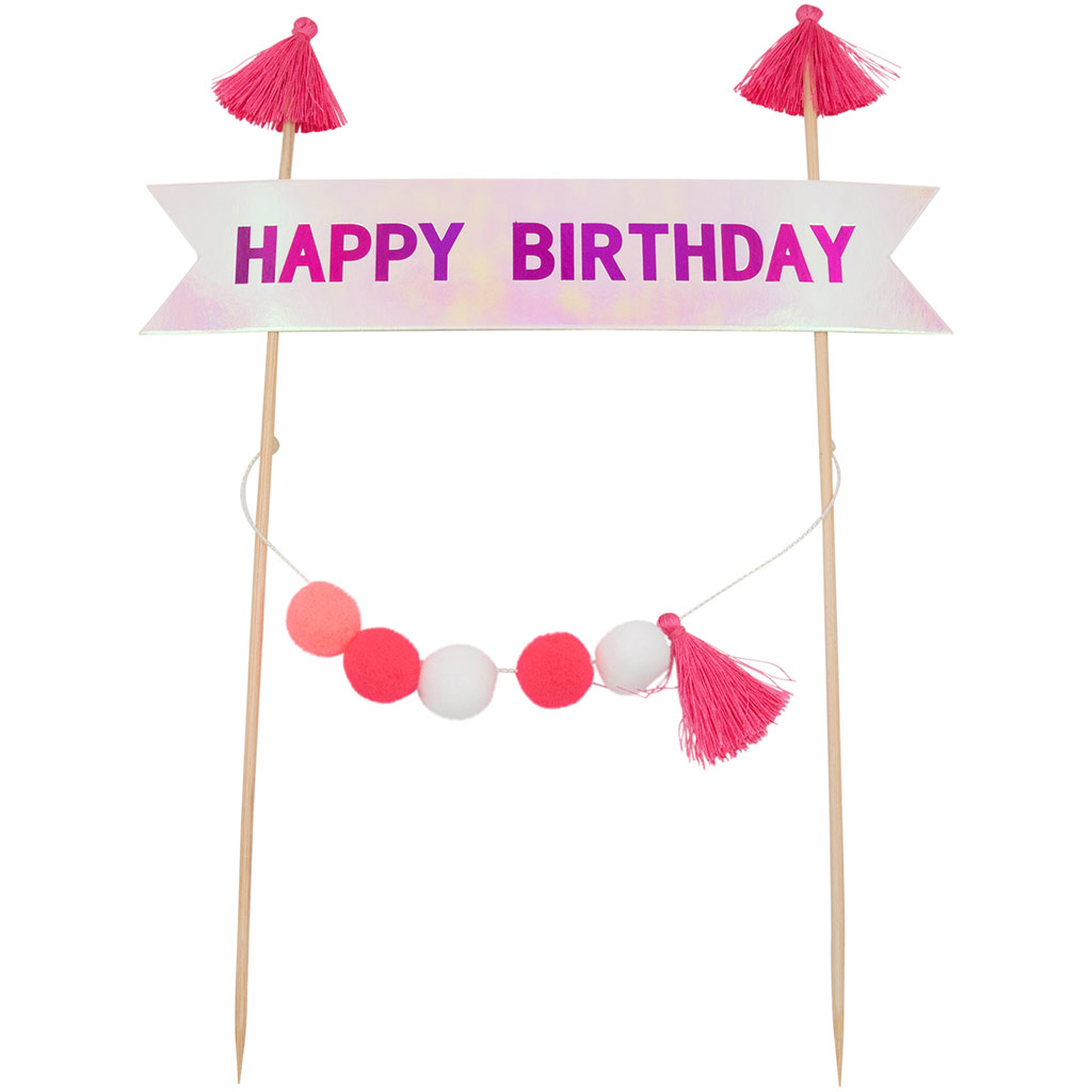טופר קישוט מרהיב לעוגה, המורכב משני קיסמים ארוכים שביניהם שרשרת פונפונים בגווני ורוד חם ולבן. בחזית כרזת HAPPY BIRTHDAY בפוייל ורוד פוקסיה.