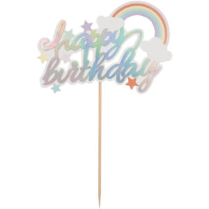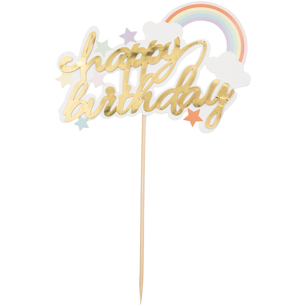 טופר קישוט מרהיב עם קשת וכוכבים, בכיתוב Happy Birthday בזהב על רקע לבן. ניתן לשלב כקישוט על עוגה, קאפקייקס ועוד.
