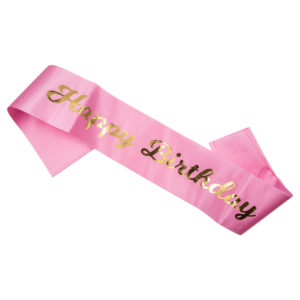 באנר HAPPY BIRTHDAY אירידיסנט ורוד, מושחל בחוט ורוד-זהב קישוט הפתעה מקסים ומוכן לתליה.