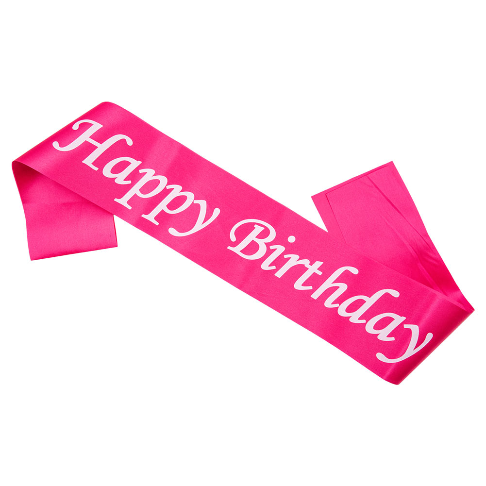 סרט קישוט מבד סאטן ורוד, עם כיתוב Happy Birthday בצבע לבן.