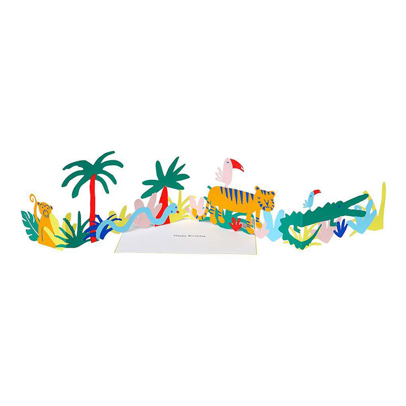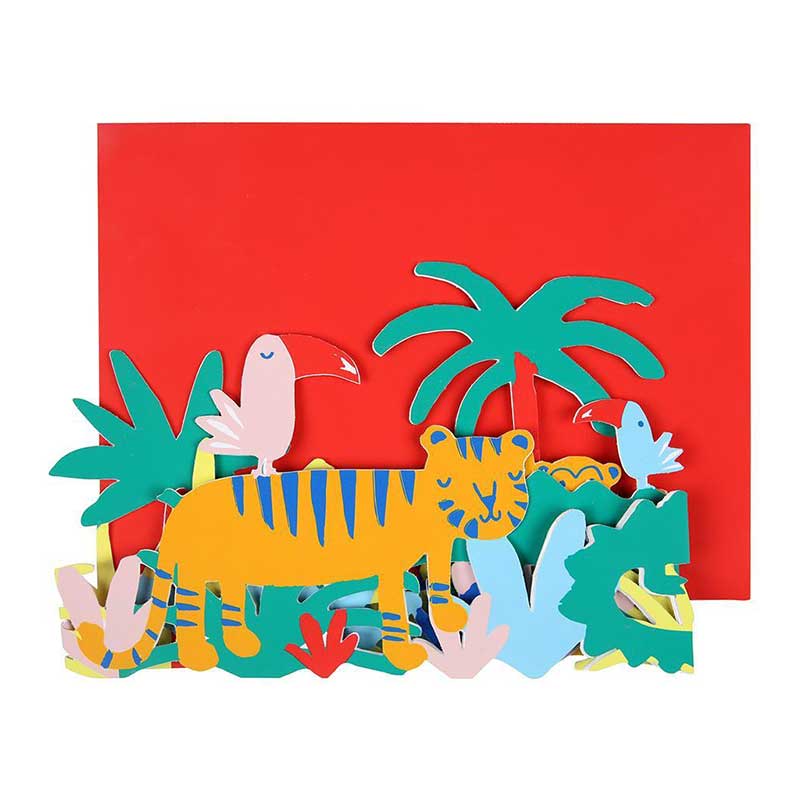 כרטיס ג 'ונגל יפהייפה זה, חייב להוסיף עידוד ליום מיוחד של מישהו. מקפלים אותו כדי ליצור גן עדן עם ציפורים צבעוניות וחיות.