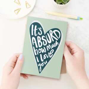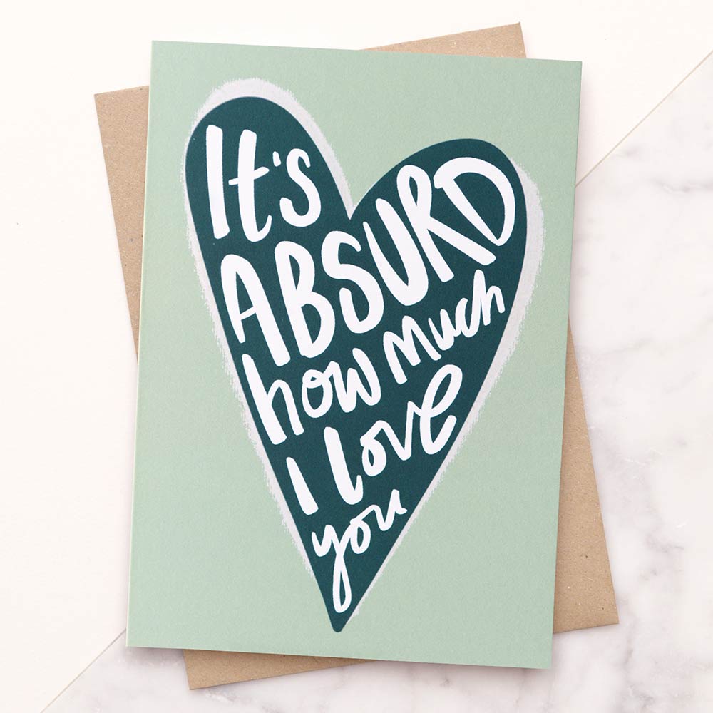 'It's absurd how much I love you' has been hand lettered in a brilliant bold teal heart.