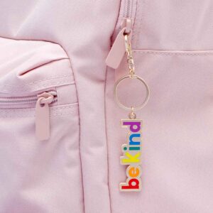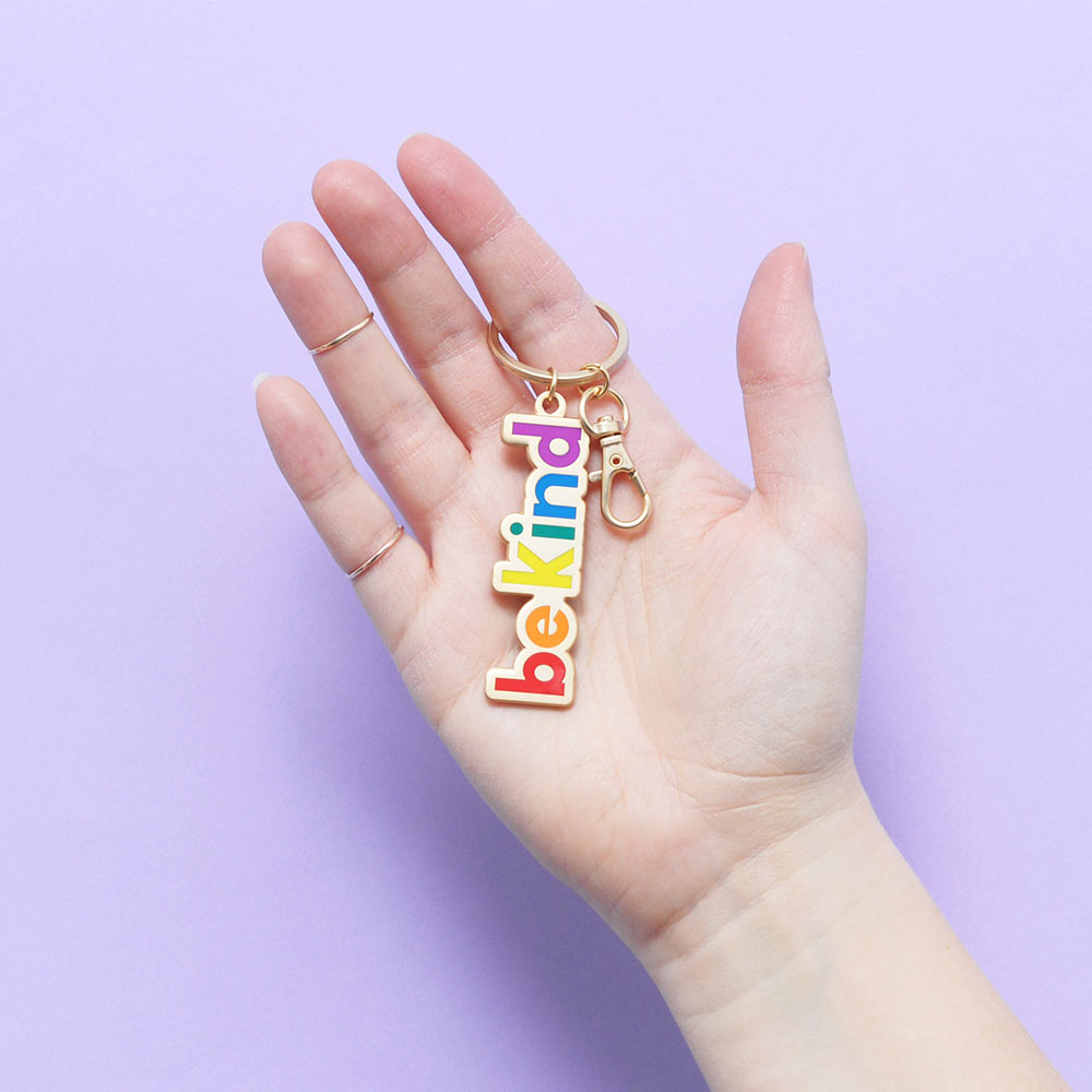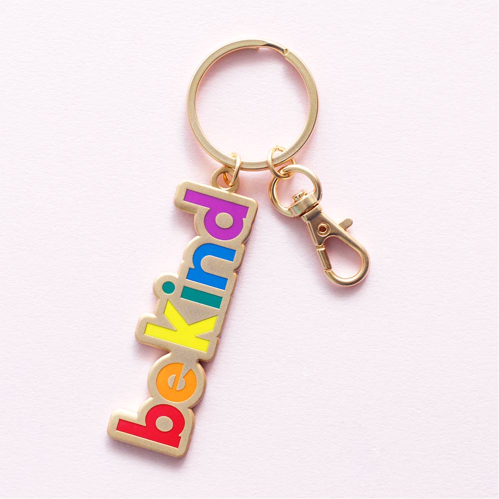 Our 'Be Kind' lettering has been recessed in a rainbow of colours in the matt gold toned metal. Complete with keyring and an extra clip, perfect for attaching to bags, backpacks or whatever you fancy adding some charm to!