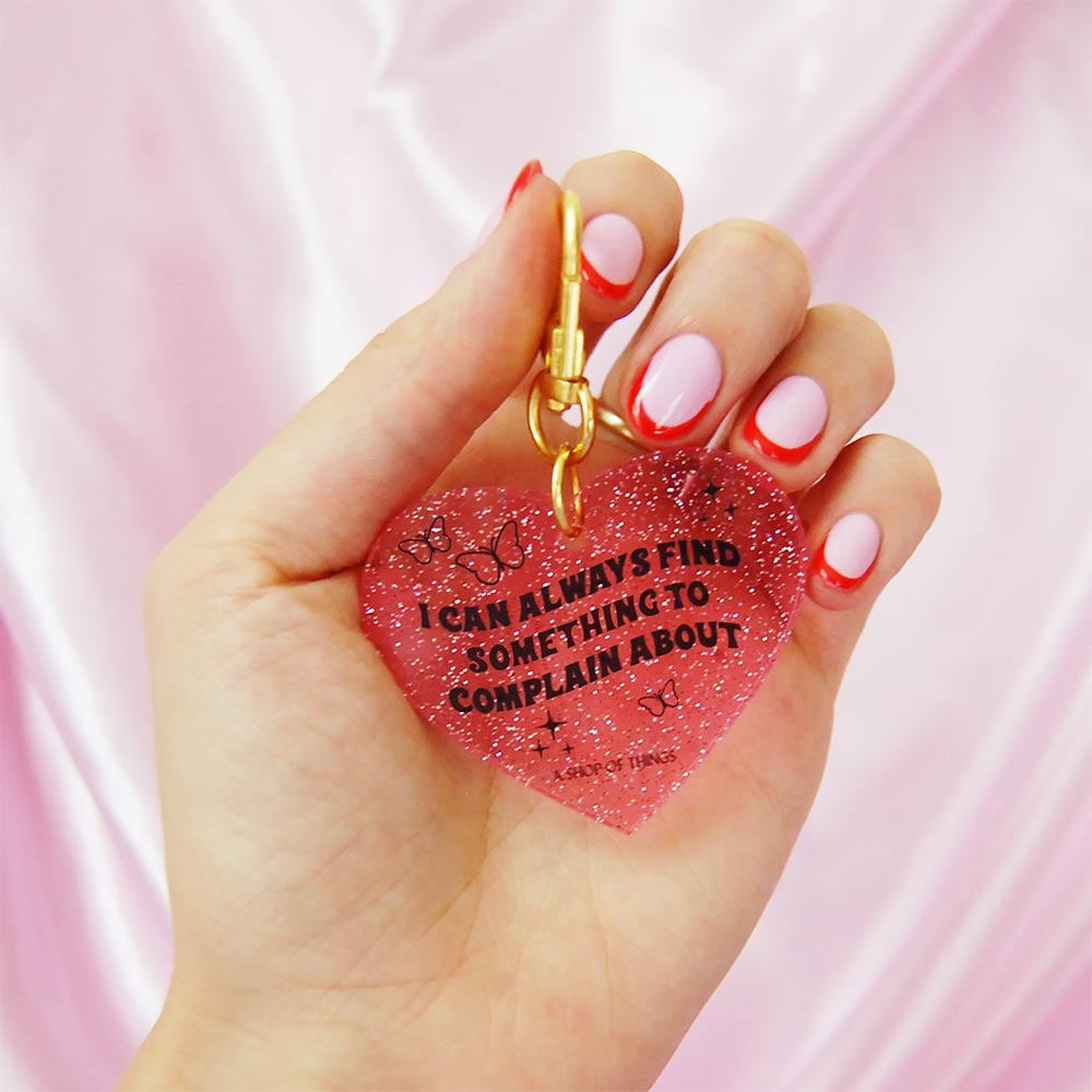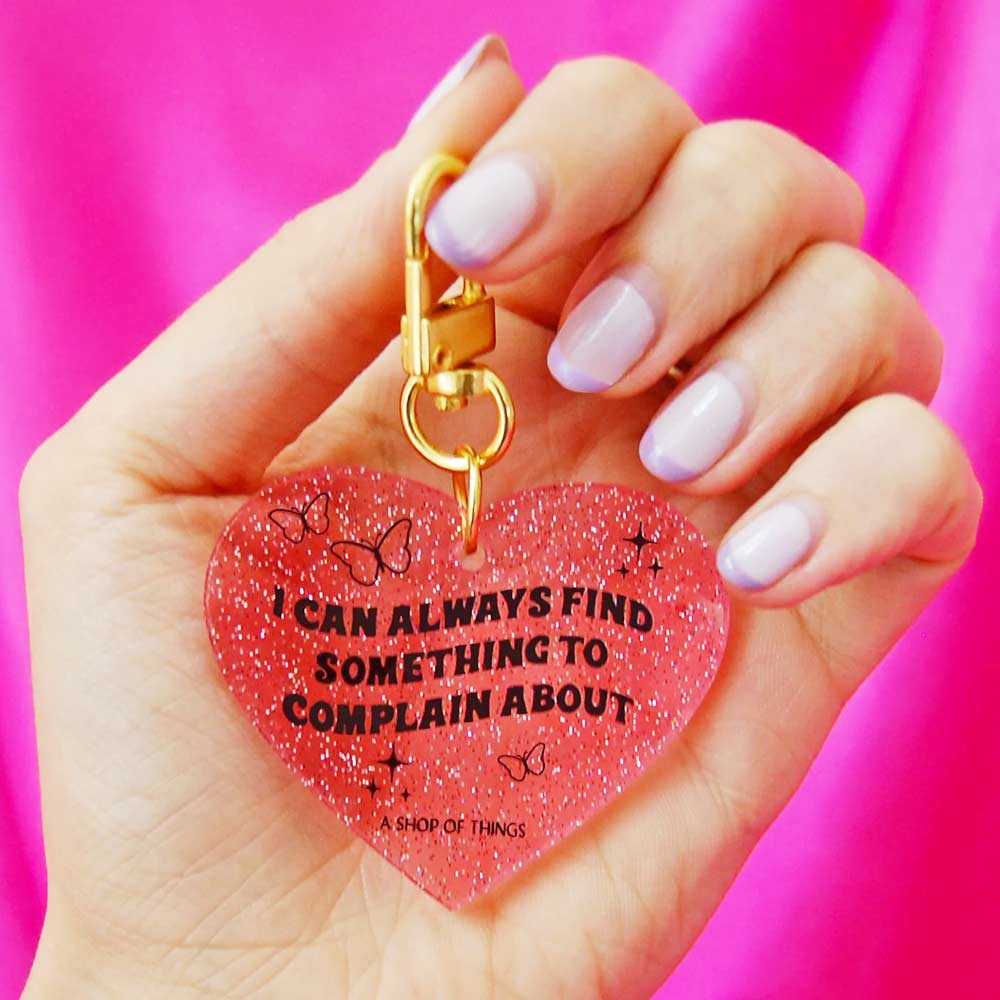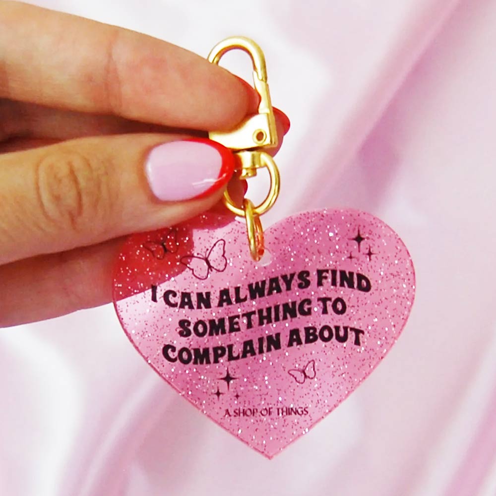 Pink glitter heart-shaped keychain says "I can always find something to complain about"