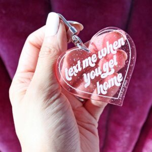 Keychain measures 2.25" x 1.875" and is pink translucent glitter acrylic.