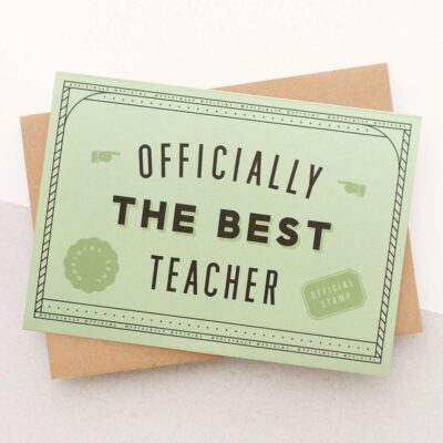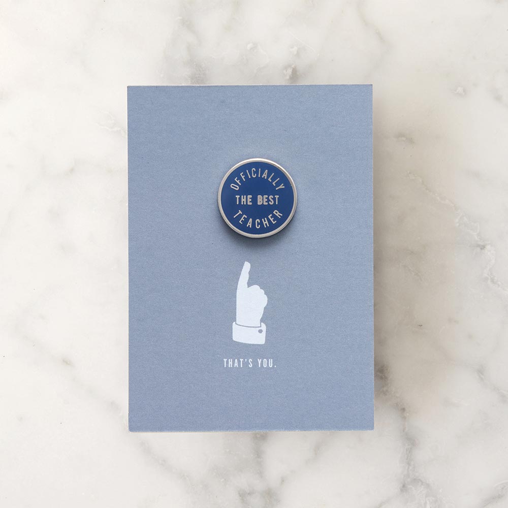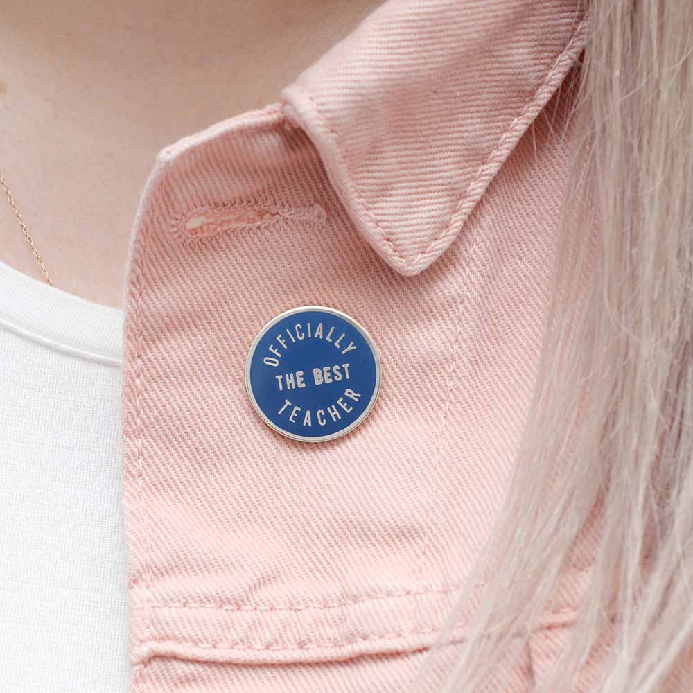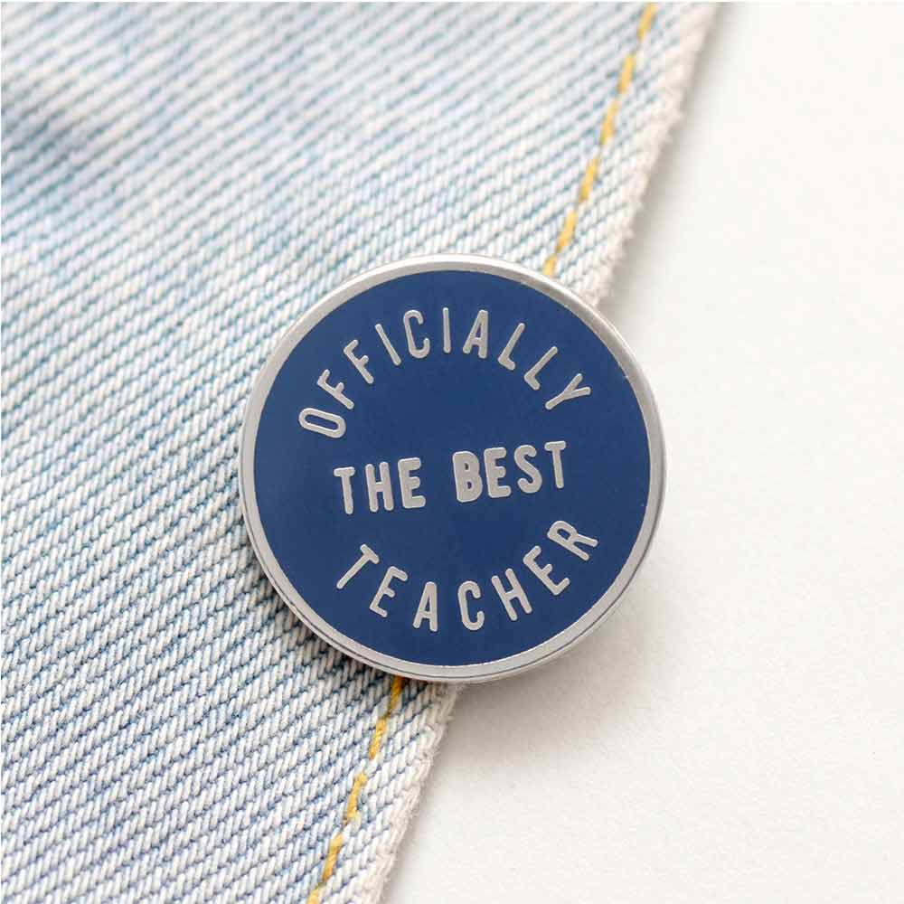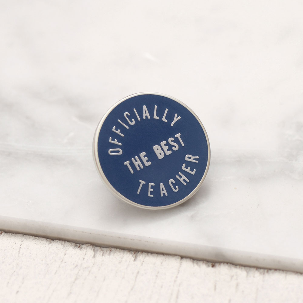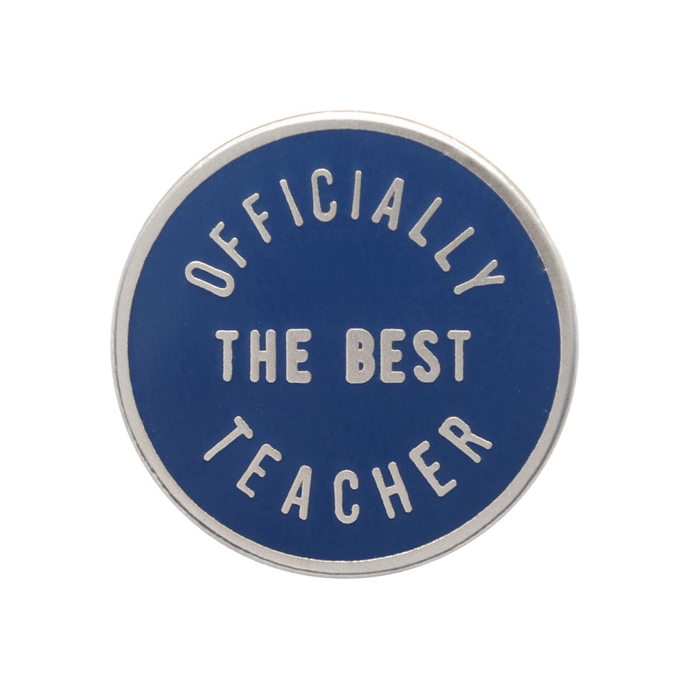 A smart metal pin badge, featuring our 'Officially the Best Teacher' design. Made from navy blue enamel and matt silver toned metal with a rubber clasp.