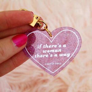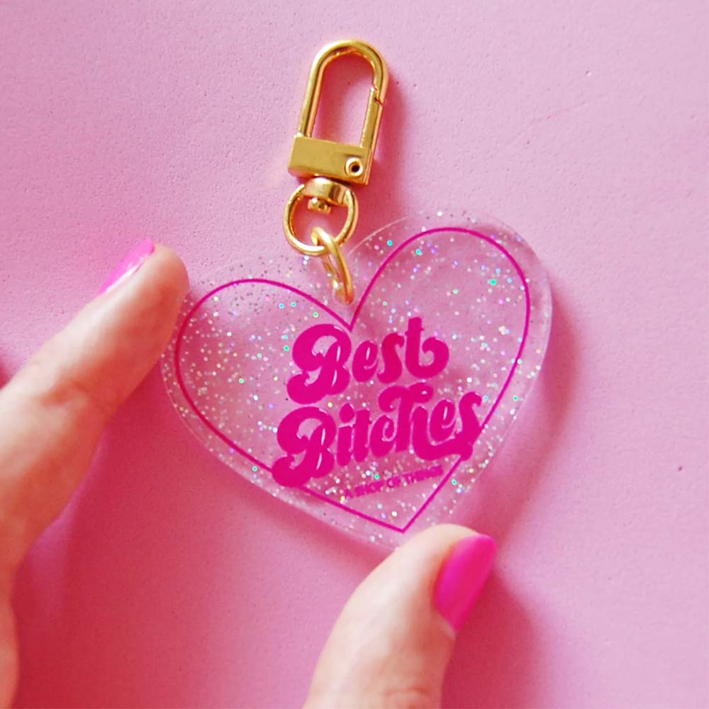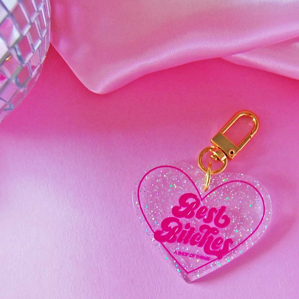 Keychain measures 2.25" x 1.875" and is clear translucent glitter acrylic.