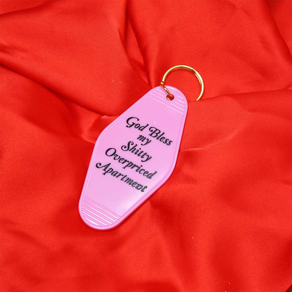 Vintage inspired motel keychain says God Bless my Shitty, Overpriced apartment.